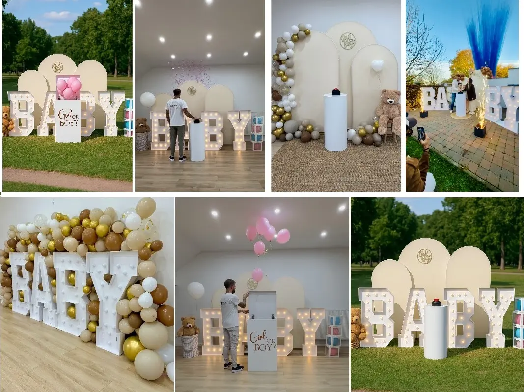 Fond décoratif, Buzzer avec jets de couleurs, La boîte Gender surprise, la coupe de fumée révélatrice, Buzzer confettis, Le ballon à exploser,...